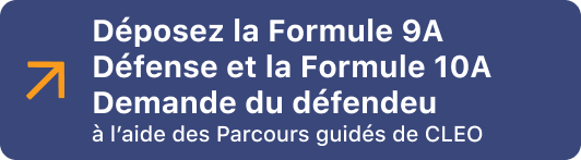 Vous devez déposer une Défense auprès de la cour avant de pouvoir déposer une Demande du défendeur. Vous disposez de 20 jours civils pour déposer votre Demande du défendeur après avoir déposé votre Défense. Cette parcours vous permet de remplir les deux formulaires simultanément. Elle contient plus d’informations sur les délais et la marche à suivre en cas d’impossibilité de les respecter.